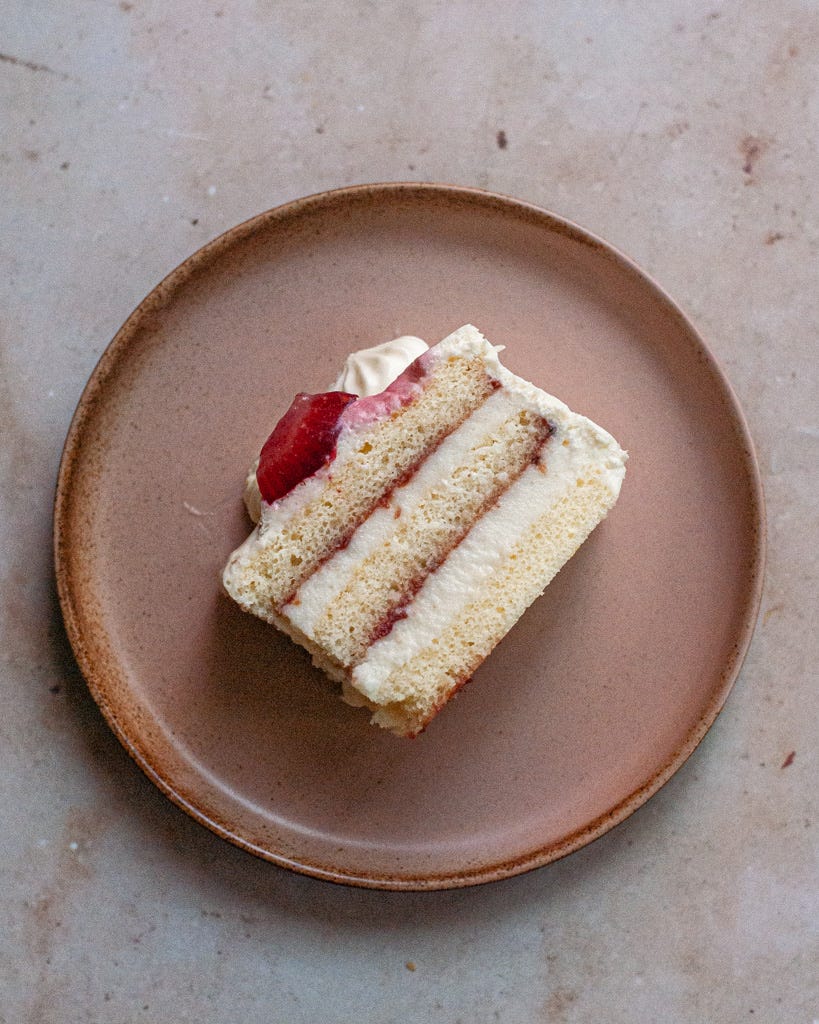In addition to the cream, I like adding both a cake soak and thin layer of jam for additional moisture and brightness. The soak can be pretty much any flavorful liquid that complements your other flavors. (I’ve used strongly brewed teas, coffee, infused syrups, the liquid from canned fruit, etc.) Use whatever jam you have on hand; if it’s particularly sweet or stiff, mix in a couple squeezes of lemon juice.