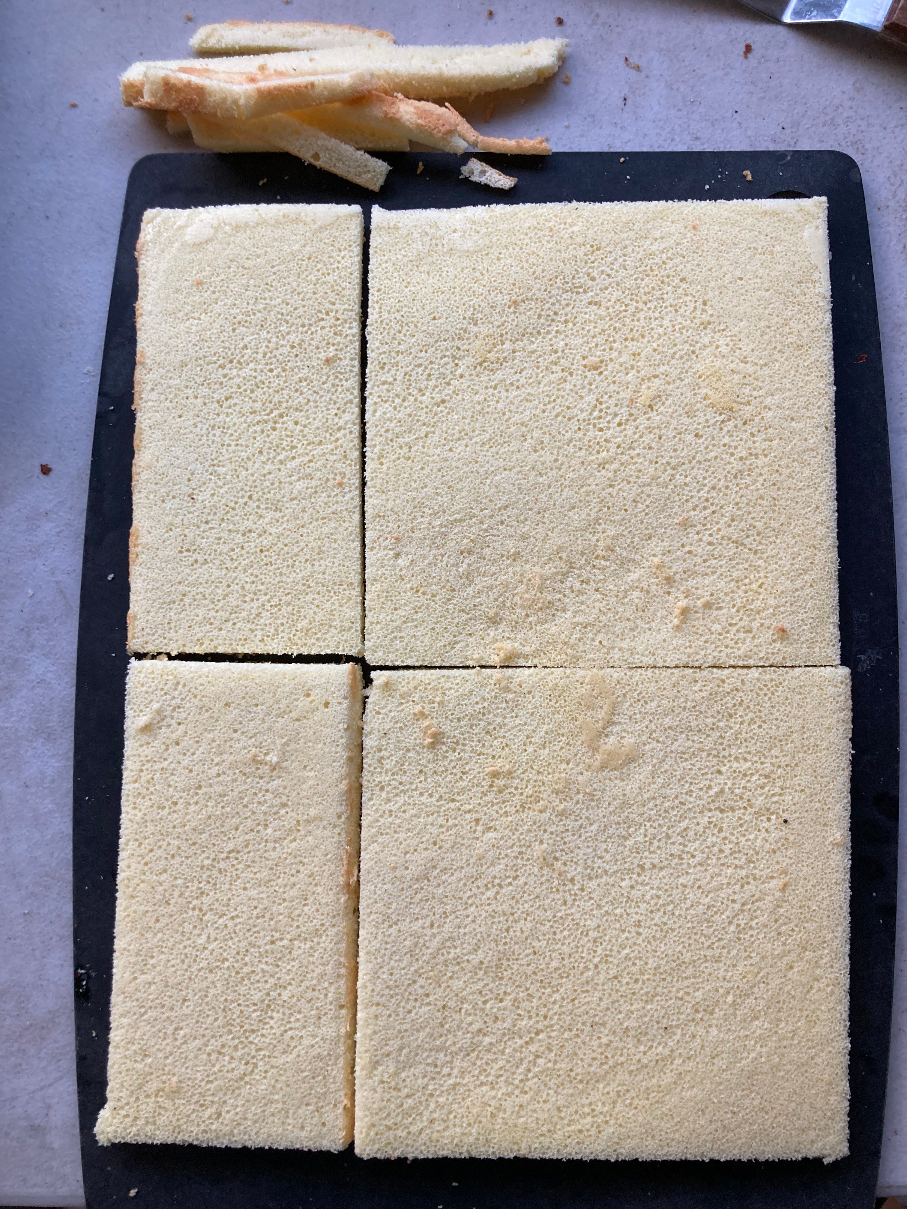 Remove any skin/crust from the sponge cake. If the cake has been wrapped in plastic, usually most of the skin comes off with the plastic wrap. But if not, just gently rub it off with your hand.